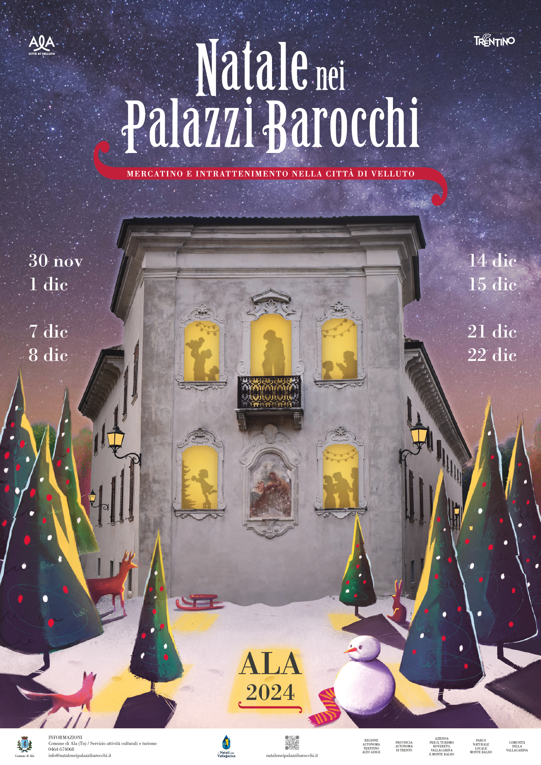 Un cielo stellato dalle sfumature cangianti e un bosco innevato popolato da piccole creature misteriose circonda un Palazzo Pizzini illuminato da cui si scorgono scene di abbracci, calore e intimità famigliare: è con questa immagine che la magica atmosfera del Natale è pronta ad avvolgerci nella nona edizione del Natale nei Palazzi Barocchi. Anche nella realtà la piazza principale di Ala e molti punti del centro storico saranno invasi da boschi incantati, permettendoci di passeggiare tra alberi invernali, ascoltare storie scaldandoci intorno al fuoco e ammirando il lavoro di uno scultore che, partendo da un ceppo di legno, dà vita a un’opera d’arte. Ogni sera le vie e gli alberi delle piazze si illumineranno e si aprirà la casella di un calendario dell’Avvento tutto speciale. Babbo Natale aspetterà le bambine e i bambini per scrivere le letterine dei desideri; un’incantevole carrozza ci trasporterà alla scoperta degli angoli più suggestivi della nostra città.